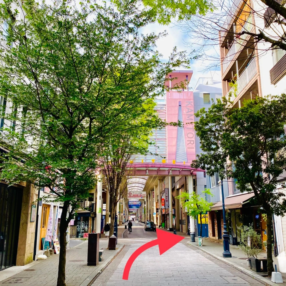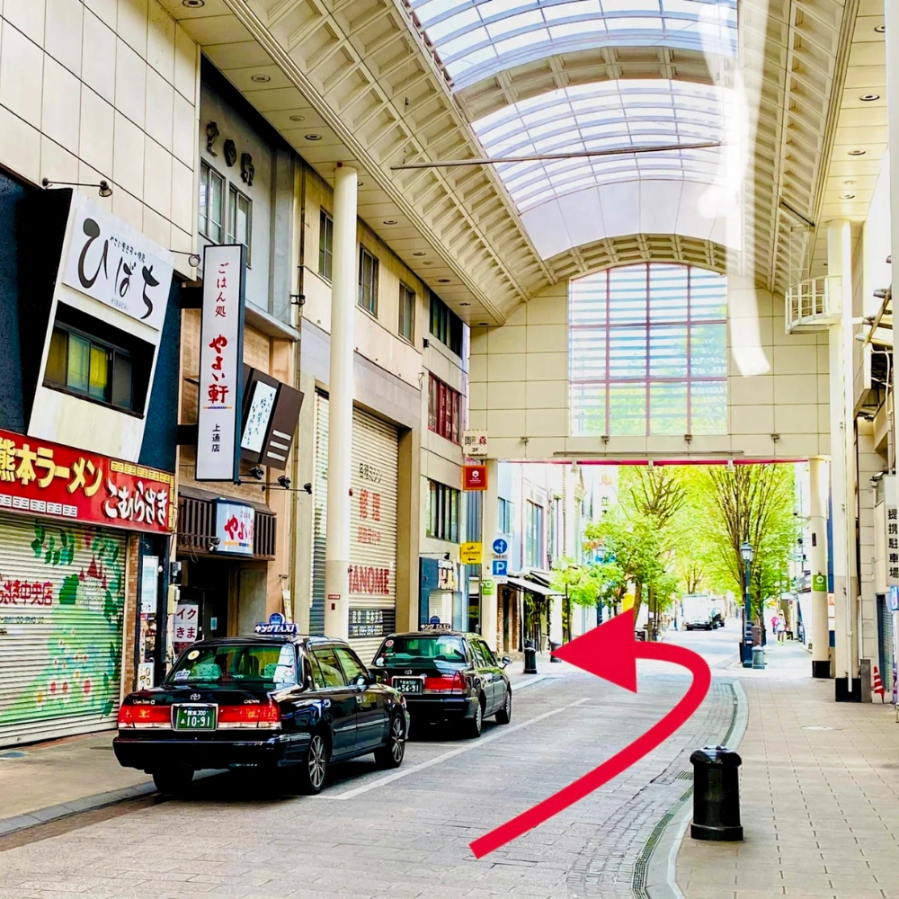 - 駅を出て右折し、道路を渡り「並木坂通り」を上通アーケードに向かって直進。