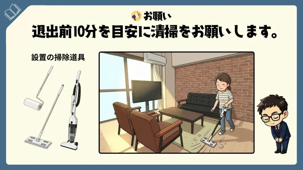 - 清掃:モップやコロコロ、(粘着ローラー)掃除機などで床を清掃お願いします。