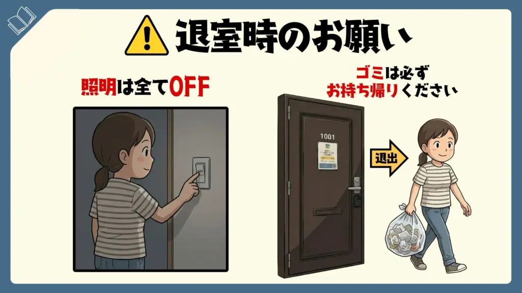 - 鍵の返却:鍵は必ずキーボックスにお戻しください。