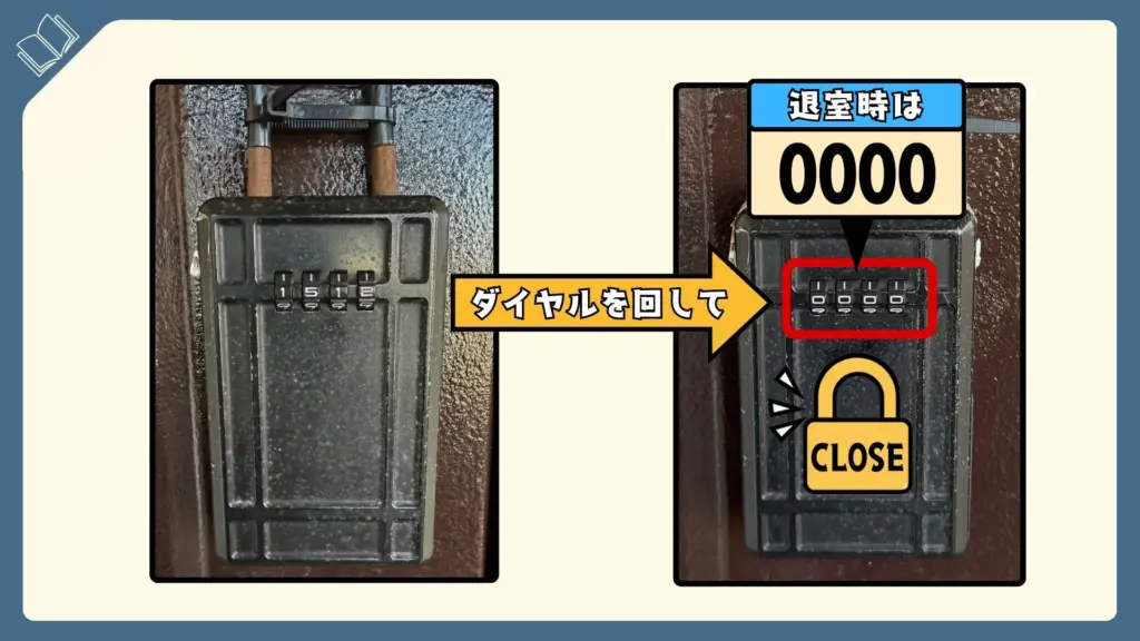 - キーボックス施錠:キーボックスの暗証番号を「0000」に戻してください。