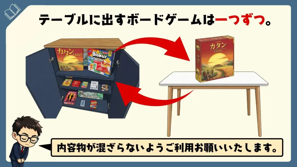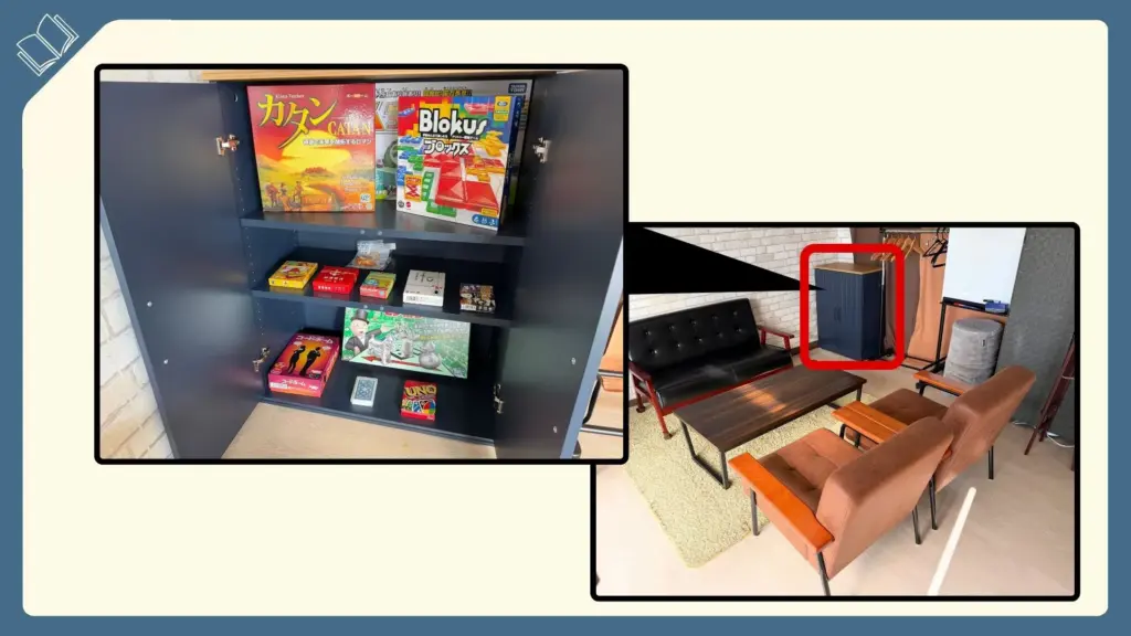 - 原状回復:イスやテーブル、その他備品を動かした場合は、必ず元の場所にお戻しください。