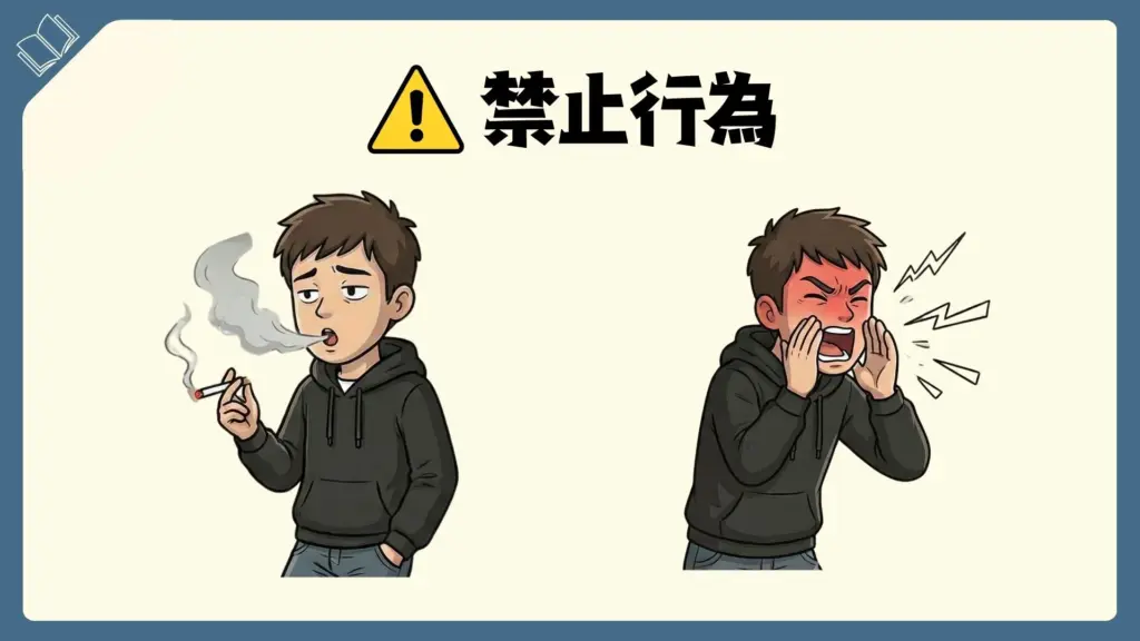 - 騒音クレームにつながる行為:過度な大声や大音量のBGMなど、近隣の迷惑となる行為。騒がしいパーティーや懇親会でのご利用はご遠慮ください。